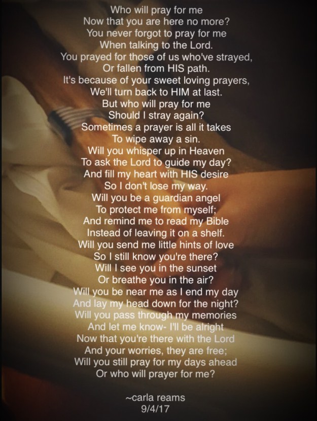 Who Will Pray For Me? Leave a reply Share this: Share on X (Opens in new window) X Share on Facebook (Opens in new window) Facebook Like Loading... Related